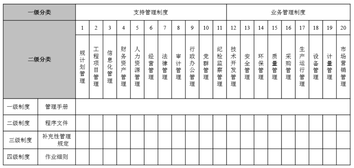 1、建立支撐戰(zhàn)略、符合企業(yè)運(yùn)營管理特點(diǎn)的制度框架,確保制度建設(shè)“橫向到邊,縱向到底”,無盲區(qū)。