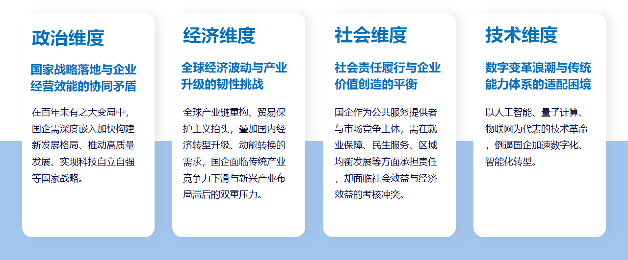 2025年開啟的十五五時(shí)期,是我國(guó)全面建設(shè)社會(huì)主義現(xiàn)代化國(guó)家的關(guān)鍵階段,也是國(guó)企深化改革、重塑競(jìng)爭(zhēng)優(yōu)勢(shì)的戰(zhàn)略窗口期。國(guó)企作為國(guó)民經(jīng)濟(jì)的壓艙石與國(guó)家戰(zhàn)略的執(zhí)行者,既承載著鞏固公有制經(jīng)濟(jì)主體地位、服務(wù)國(guó)家重大戰(zhàn)略的政治使命,又需在全球經(jīng)濟(jì)格局深度調(diào)整、科技革命加速演進(jìn)、社會(huì)治理復(fù)雜化的背景下,破解多重維度的核心矛盾,實(shí)現(xiàn)政治屬性與市場(chǎng)屬性的有機(jī)統(tǒng)一。