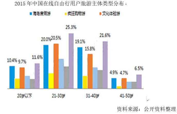 從自由行主題角度來看,50.7%用戶偏好文化體驗游,而且該主題的旅游漸向20-40歲青年、中年群體拓展??梢姡幕糜螡u漸受到旅客的追捧,市場空間不斷擴大。