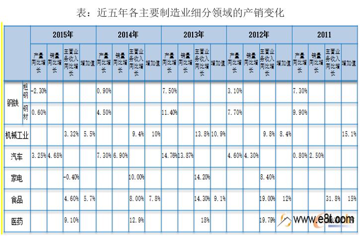 數(shù)據(jù)顯示,鋼鐵、機(jī)械工業(yè)、汽車(chē)、家電、食品、醫(yī)藥等行業(yè)2015增速均放緩,有的行業(yè)如鋼鐵、家電甚至出現(xiàn)負(fù)增長(zhǎng)。