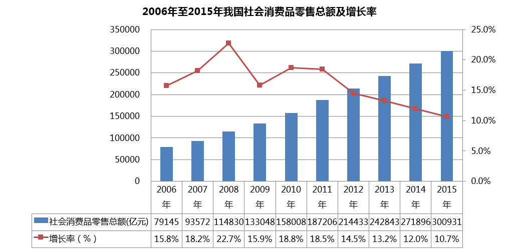 自2006年開始的十年間,我國的社會(huì)消費(fèi)品零售總額逐年穩(wěn)定增長,但增速在逐漸下滑。