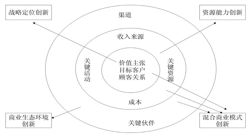 混合商業(yè)模式創(chuàng)新是一種戰(zhàn)略定位創(chuàng)新、資源能力創(chuàng)新和商業(yè)生態(tài)環(huán)境創(chuàng)新相結(jié)合的方式。一般而言,企業(yè)的商業(yè)模式創(chuàng)新都是混合式的,因?yàn)樯虡I(yè)模式的構(gòu)成要素中,戰(zhàn)略定位、內(nèi)部資源、外部環(huán)境之間是相互依賴、相互作用的,每一部分的創(chuàng)新都會引起另一部分的相應(yīng)變化。