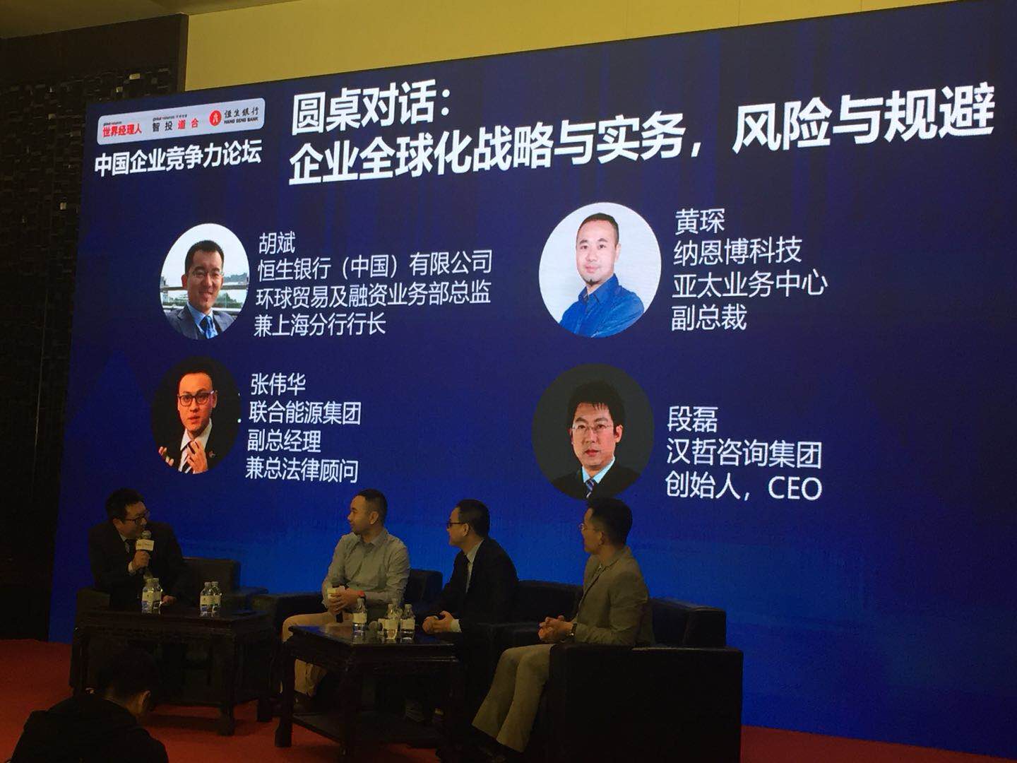 同時(shí),段磊博士還應(yīng)邀主持了本次論壇的圓桌對(duì)話(huà),與恒生銀行環(huán)球貿(mào)易與融資業(yè)務(wù)部胡斌總監(jiān)、聯(lián)合能源副總經(jīng)理張偉華先生、納恩博科技亞太業(yè)務(wù)中心副總裁黃琛先生同臺(tái),深入探討了中國(guó)民企全球化的機(jī)遇與挑戰(zhàn),企業(yè)在全球化過(guò)程中的內(nèi)部變革,以及面向當(dāng)前形勢(shì)的全球化路徑與風(fēng)險(xiǎn)控制,現(xiàn)場(chǎng)觀眾也與嘉賓踴躍互動(dòng),進(jìn)行了深入的研究與探討。