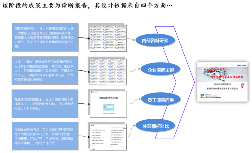 項(xiàng)目啟動(dòng)之初,通過(guò)內(nèi)部資料研究、企業(yè)深度訪談、員工調(diào)查問(wèn)卷、外部標(biāo)桿資料對(duì)比,政策研究等維度進(jìn)行全面診斷,發(fā)現(xiàn)問(wèn)題并提出改進(jìn)的思路。