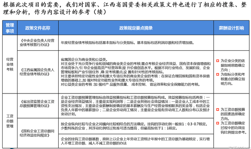 下屬單位領(lǐng)導(dǎo)班子考核薪酬設(shè)計(jì)中,更加注重對(duì)于國(guó)家以及當(dāng)?shù)氐膰?guó)資等在國(guó)企考核管理方面的政策要求,同時(shí)充分借鑒漢哲國(guó)資案例庫(kù)的案例,對(duì)下屬單位進(jìn)行了分類考核的設(shè)計(jì)。