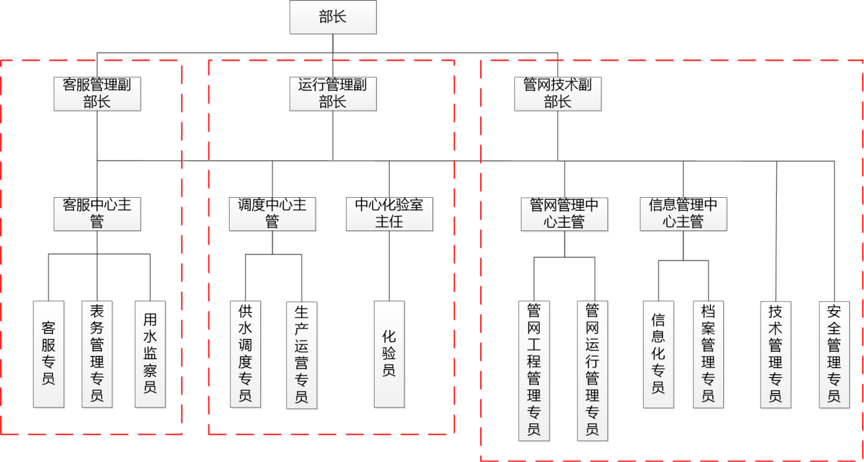 新的管理團隊進入后,對原來的組織架構(gòu)進行了調(diào)整,形成 “5部4公司”的組織架構(gòu),即綜合管理部、計劃財務(wù)部、人力資源部、黨群工作部、運營技術(shù)部和自來水公司、惠民區(qū)域供水公司、XX建設(shè)工程公司、XX污水處理公司。