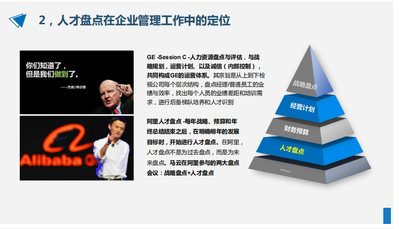 在GE、阿里等企業(yè),“人才盤點(diǎn)”作為與“戰(zhàn)略盤點(diǎn)”比肩而立的一項(xiàng)重要工作,獲得CEO的高度重視與深度參與。人才盤點(diǎn)之于企業(yè)的意義,在于它能夠幫助企業(yè)對(duì)人才資源進(jìn)行有效的識(shí)別、使用和儲(chǔ)備,促進(jìn)人才的戰(zhàn)略性配置;之于個(gè)體的意義,在于它能夠幫助員工個(gè)體認(rèn)識(shí)能力的優(yōu)劣,揚(yáng)長(zhǎng)補(bǔ)短,發(fā)展提升。