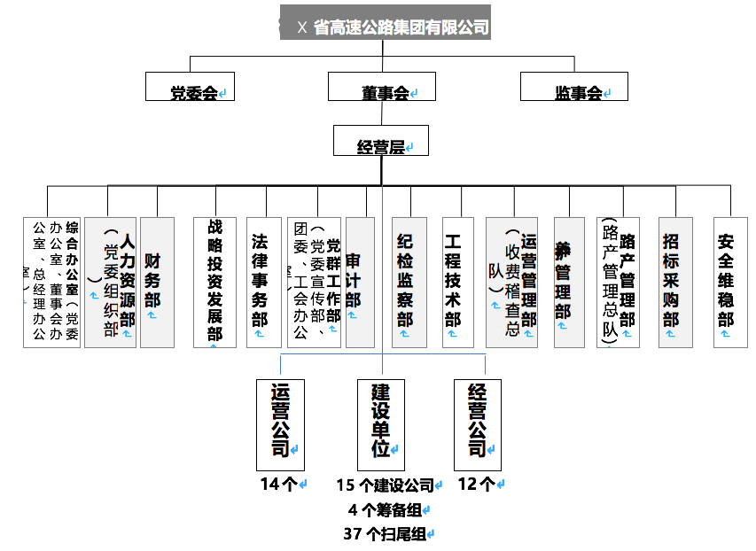 該公司成立于1993年3月,在2018年9月27日整體改制,改制后企業(yè)類型變更為“有限責(zé)任公司”,主要從事高速公路建設(shè)、收費、養(yǎng)護和經(jīng)營開發(fā)以及沿線資源開發(fā) ,同時兼具廣告、地產(chǎn)開發(fā)、物業(yè)、物流等多種衍生業(yè)務(wù);到2018年底,管轄高速公路里程達4969公里,管轄服務(wù)區(qū)73.5對;公司資產(chǎn)規(guī)模超過4600億元,營業(yè)收入達到141億元。共有正式員工13000人左右正式員工,4000人左右勞務(wù)派遣員工,下設(shè)14個市州管理處、1個監(jiān)控中心、15個在建高速公路項目公司、4個項目籌備組、37個掃尾組及12個二級經(jīng)營公司。