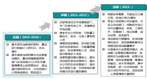 圍繞公司的五年規(guī)劃,提出其組織管控的三個階段發(fā)展路線圖,據(jù)此提出近期、中期、遠期三個階段的組織優(yōu)化方案,細化近期和中期的部門職責(zé)劃分。