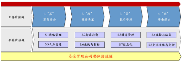 現(xiàn)代企業(yè)組織架構設計的基石——流程管理,建立波特價值鏈模型,通過分析基金投資企業(yè)業(yè)務流程形成的價值鏈來設計企業(yè)組織架構。邁克爾· 哈默:優(yōu)秀的流程將使成功的企業(yè)與其他競爭者區(qū)分開來,清晰的業(yè)務流程能理清組織架構關系和理順信息流程,為架構組織奠定基礎。