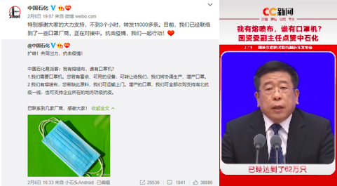 口罩協(xié)同生產(chǎn)案例:2月6日下午,中石化在官方微博發(fā)布消息稱,中石化易派客(中石化旗下電子商務(wù)網(wǎng)站)正尋找口罩機(jī),截至2月7日中午,中國石化就已與合作伙伴對接完成11條口罩生產(chǎn)線。據(jù)初步估算,到2月29日,實(shí)現(xiàn)新增產(chǎn)能至60萬片/日,3月10日,實(shí)現(xiàn)新增產(chǎn)能至100萬片/日以上。與此同時(shí),中國石化也已經(jīng)聯(lián)系到3家地方的口罩生產(chǎn)企業(yè),為他們提供熔噴布原料和協(xié)調(diào)生產(chǎn)設(shè)備,其中房山區(qū)的1家企業(yè),馬上供料就可日產(chǎn)口罩3.5萬片。