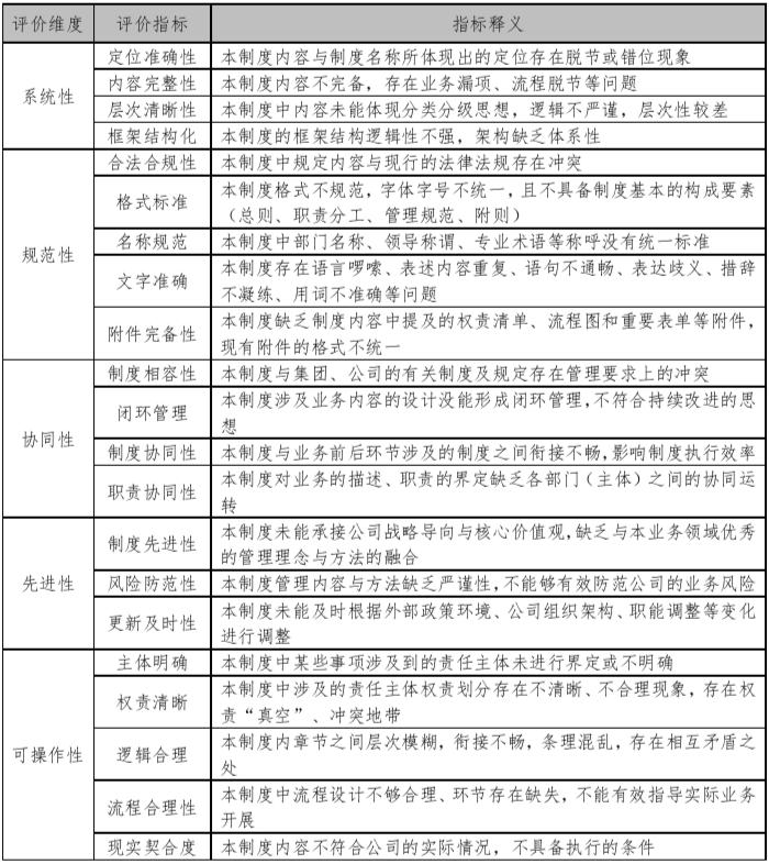 筆者結(jié)合項(xiàng)目經(jīng)驗(yàn),從系統(tǒng)性、規(guī)范性、協(xié)同性、先進(jìn)性及可操作性等五大維度總結(jié)了如下制度評(píng)估模型,進(jìn)而為制度評(píng)估提供了有效工具。