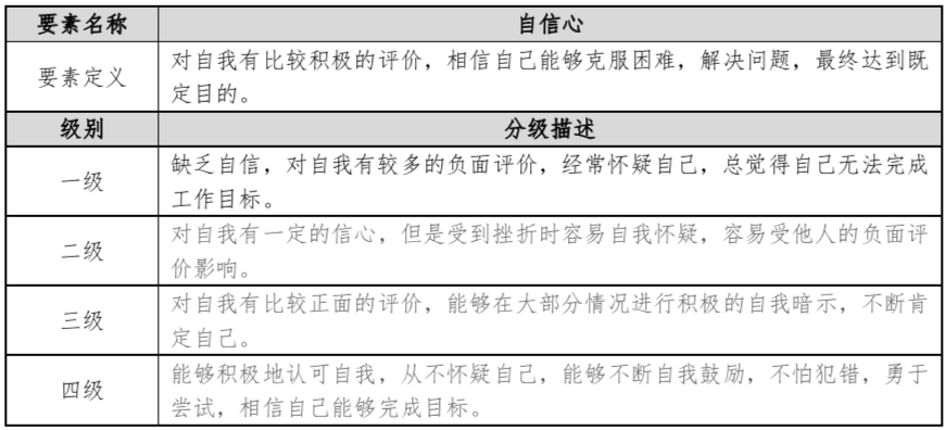 根據(jù)上述構(gòu)建的領(lǐng)導(dǎo)力模型,筆者參考“漢哲咨詢”開發(fā)的《HAN-82勝任力模型分類詞典》,對此次構(gòu)建的領(lǐng)導(dǎo)力模型的九個要素分別進(jìn)行了指標(biāo)定義及分級標(biāo)準(zhǔn)描述。比如:自信心: