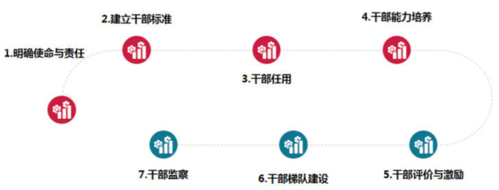 華為的干部管理七步曲,包括:明確使命與責(zé)任;建立干部標(biāo)準(zhǔn);干部任用程序;干部能力發(fā)展;干部評(píng)價(jià)與激勵(lì);干部梯隊(duì)建設(shè)和后備干部培養(yǎng);干部監(jiān)察。