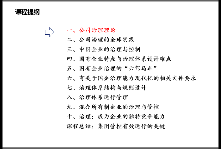 作為從事公司治理培訓(xùn)達(dá)15年的資深講師,段磊博士的課程從福特與康柏的故事開(kāi)始,首先介紹了公司治理的理論體系、全球?qū)嵺`、中國(guó)企業(yè)的治理與控制模式、國(guó)有企業(yè)特點(diǎn)與治理體系設(shè)計(jì)難點(diǎn),在此基礎(chǔ)上,系統(tǒng)介紹了國(guó)企治理體系設(shè)計(jì)所依據(jù)的政策與文件精神,以及國(guó)企“六駕馬車”治理體系的結(jié)構(gòu)設(shè)計(jì)、規(guī)則設(shè)計(jì)與運(yùn)行管理體系設(shè)計(jì)。同時(shí),基于混合所有制改革日益深入的趨勢(shì),專題介紹了混合所有制企業(yè)的治理與管控方式,最后,以三家優(yōu)秀國(guó)企治理體系的設(shè)計(jì)與運(yùn)作作為結(jié)尾,深刻地提出了“讓公司治理成為企業(yè)獨(dú)特競(jìng)爭(zhēng)能力”的論斷。