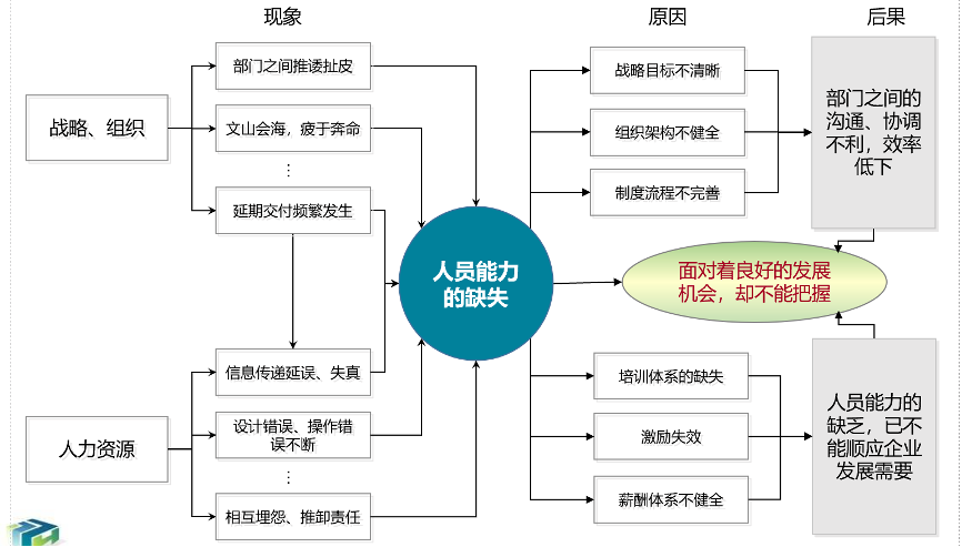 漢哲咨詢項目組認(rèn)為:人員能力的缺失,使得公司對發(fā)展中遇到的問題缺乏有效的分析和解決能力;隨著問題不斷的積累,已經(jīng)嚴(yán)重的阻礙了公司的發(fā)展。