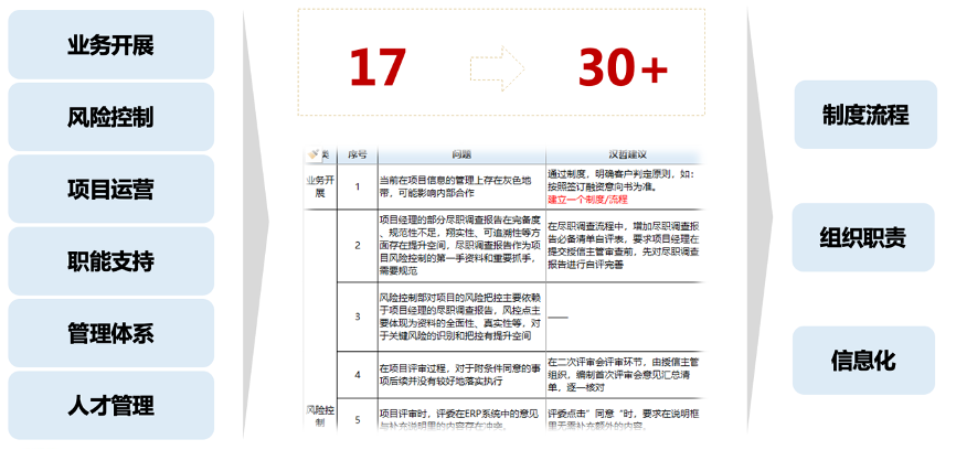 項(xiàng)目組從業(yè)務(wù)開(kāi)展、風(fēng)險(xiǎn)控制、項(xiàng)目運(yùn)營(yíng)、職能支持、管理體系、人才管理等維度開(kāi)展評(píng)估,提出問(wèn)題優(yōu)化建議。