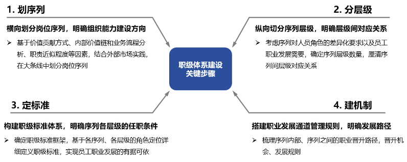 一個完整的職級體系建設(shè)項目,應(yīng)主要包括“劃序列-分層級-定標(biāo)準(zhǔn)-建機制”四個操作步驟。下面筆者擬從上述四個關(guān)鍵步驟入手,結(jié)合項目實踐經(jīng)驗,對上述問題進行探討。