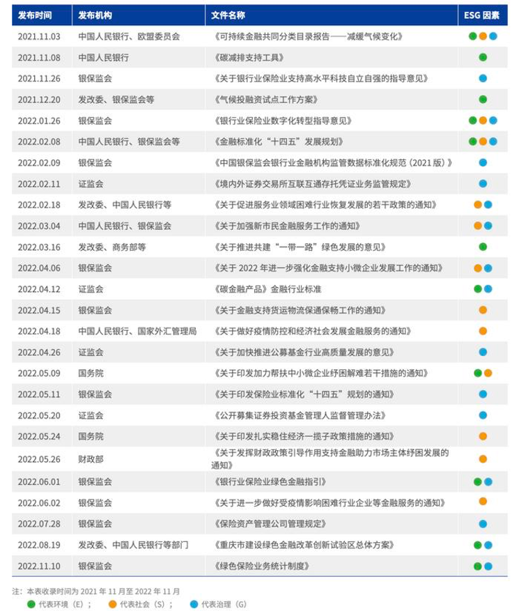 雖然ESG這一概念在2007年才被正式提出來,但是進入21世紀以來,我國陸續(xù)出臺了一系列相關(guān)政策法規(guī)來規(guī)范和引導(dǎo)ESG活動。 最早可追溯到2002年初,中國證監(jiān)會、原國家經(jīng)濟貿(mào)易委員會聯(lián)合發(fā)布了《上市公司治理準則》,闡明了我國上市公司治理的基本原則,自此至2022年底,我國一共出臺了84部政策法規(guī)。僅2021年11月至2022年11月一年內(nèi)的ESG相關(guān)政策文件就有22個(如下圖)。