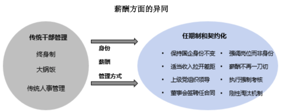 傳統(tǒng)干部管理與任期制和契約化形式下的干部管理從管理主體、薪酬管理和績(jī)效管理等方面均存在一定的差異。