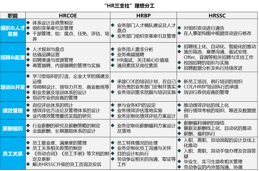 因此,誕生了人力資源管理的三支柱模式,把原來的按照職能劃分的方式換成了“高中基”的不同專業(yè)化程度的切分,也就是HR三支柱的COE(高級職能,政策中心,工作內(nèi)容主要是制定人力資源戰(zhàn)略、政策、流程、體系、方案等,像專家、顧問);HRBP(中級職能,緊貼業(yè)務(wù)、執(zhí)行政策,是更基于業(yè)務(wù)導(dǎo)向的人力資源解決方案提供和執(zhí)行者);SSC(基礎(chǔ)職能,支持服務(wù),工作內(nèi)容主要是日常操作事務(wù)類工作,是標(biāo)準(zhǔn)化的服務(wù)提供者)。簡單來說,三支柱是基于HR六大模塊,并將每個模塊以制定戰(zhàn)略——執(zhí)行——基礎(chǔ)事務(wù)的縱向工作方式進行劃分。