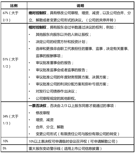 • 大股東比例略大于其余兩個(gè)小股東的比例,但未達(dá)到67%。