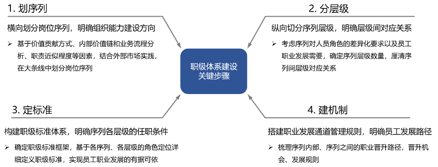 職級體系建設項目整體按“劃序列、分層級、定標準、建機制”四個步驟開展工作: