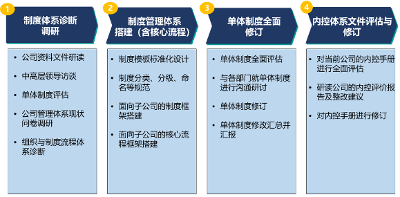 第一階段,制度體系診斷調(diào)研。主要通過(guò)從資料研讀、中高層訪(fǎng)談、問(wèn)卷調(diào)研、制度梳理與評(píng)估、組織職能套表調(diào)研等方式開(kāi)展調(diào)研工作,了解各級(jí)員工對(duì)公司制度、流程、內(nèi)控體系優(yōu)化的意見(jiàn)或建議,并編制診斷報(bào)告;
