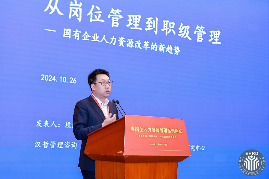 10月26日,中國人力資源開發(fā)研究會企業(yè)人才分會主辦的央國企人力資源管理案例論壇在北京京都信苑飯店隆重舉行,來自央企、地方國企及人力資源服務機構的從業(yè)者、轉(zhuǎn)件三百多人參與了本次論壇。在本次論壇上,來自國網(wǎng)上海電力、中國核建、國家能源集團共享服務中心、建行浙江分行、中國東方航空等央企的人力資源高管,以及來自漢哲、華夏基石、北森、關愛通的資深專家,紛紛發(fā)表精彩演講,共同探討央國企人力資源管理發(fā)展與創(chuàng)新中的優(yōu)秀實踐。受論壇邀請,漢哲咨詢首席專家段磊博士發(fā)表了題為《從崗位管理到職級管理-國有企業(yè)人力資源改革的新趨勢》的專題演講。