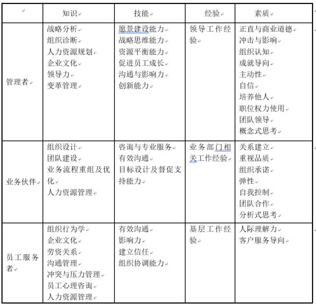 (1)所謂“三種角色”。人力資源經(jīng)理必須具備以下三種角色:一是作為企業(yè)的決策層以及本部門的負責人,必須承擔領(lǐng)導者的責任,尤其是領(lǐng)導團隊中人力資源專家的責任;二是作為一線部門或業(yè)務(wù)部門的支持者,必須致力于保證企業(yè)擁有實現(xiàn)經(jīng)營目標和戰(zhàn)略所需要的各種專業(yè)、各種層次的人才,以及設(shè)計激勵這些人才發(fā)揮作用的管理方法;三是作為員工服務(wù)者,必須讓自己成為員工的貼心朋友,成為企業(yè)和員工之間的關(guān)系橋梁和紐帶。這三種角色兼顧了上、中、下三個層次,是人力資源經(jīng)理勝任力體系設(shè)計的出發(fā)點。
