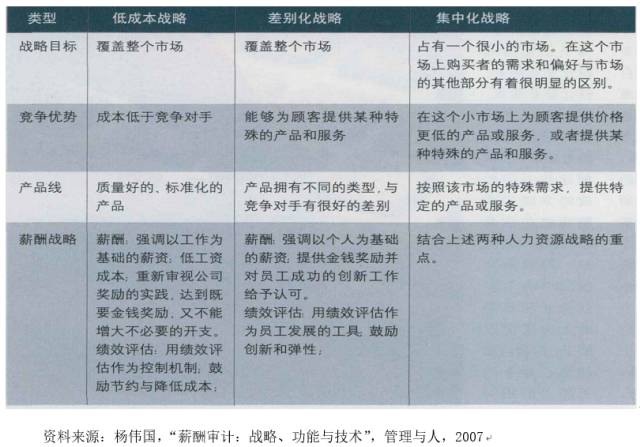 薪酬戰(zhàn)略審計(jì)的第二個(gè)層面是:當(dāng)前薪酬體系,要確保能夠支撐公司的競(jìng)爭(zhēng)戰(zhàn)略, 即:確保薪酬戰(zhàn)略與公司競(jìng)爭(zhēng)戰(zhàn)略(低成本、差別化或集中化戰(zhàn)略)相一致。不同的競(jìng)爭(zhēng)戰(zhàn)略下,應(yīng)該選擇不同的薪酬戰(zhàn)略,如下圖所示: