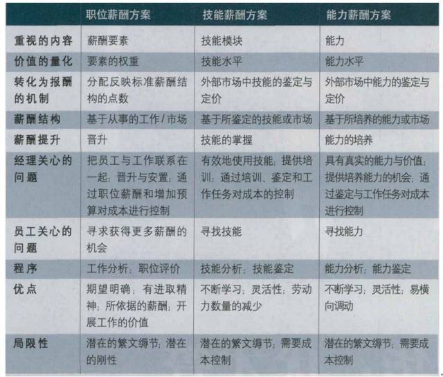 薪酬方案是對(duì)各種薪酬手段的綜合運(yùn)用。米爾科維奇·紐曼從重視的內(nèi)容、價(jià)值的量化、轉(zhuǎn)化為報(bào)酬的機(jī)制、薪酬結(jié)構(gòu)、薪酬提升、經(jīng)理關(guān)心的問(wèn)題、員工關(guān)心的問(wèn)題、程序、優(yōu)點(diǎn)、局限性等10個(gè)方面分析了職位薪酬方案、技能薪酬方案、能力薪酬方案等三種代表性薪酬方案的特點(diǎn),為薪酬技術(shù)審計(jì)提供了基準(zhǔn)。如下圖所示:
