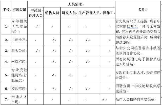 丹佛斯公司綜合運(yùn)用各種招聘渠道,根據(jù)擬聘人員的不同,靈活選用不同的招聘渠道,充分發(fā)揮了每一類招聘渠道的優(yōu)勢(shì),從而建立起最有效、最具優(yōu)勢(shì)的招聘來源。如下表所示: