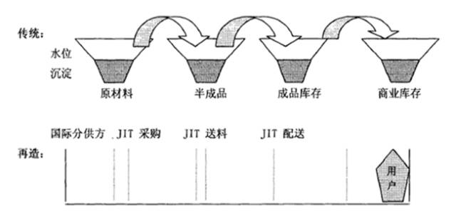 物流整合開始后,第一步就是整合采購,將集團所有事業(yè)部的物資集中采購,通過規(guī)模優(yōu)勢,納入國際化供應(yīng)商,在全球范圍內(nèi)采購質(zhì)優(yōu)價廉的零部件,既降低產(chǎn)品成本、提高產(chǎn)品的競爭力,又保持了產(chǎn)品質(zhì)量的一致性。有的分供方還直接參與了海爾的產(chǎn)品設(shè)計,通過與國際化分供方建立起密切合作的伙伴關(guān)系,實現(xiàn)了采購JIT。同時,在內(nèi)部實施ERP管理系統(tǒng),通過以ERP為后臺的B2B網(wǎng)上采購與網(wǎng)上招標、網(wǎng)上支付,實現(xiàn)了集團內(nèi)部生產(chǎn)、庫存、銷售、財務(wù)、人力資源與外部供應(yīng)商和分銷商信息的共享與共同計劃,最大限度地縮短了采購周期。在儲運方面,統(tǒng)一運輸,優(yōu)化運輸網(wǎng)絡(luò),通過SST機制整合郵政的配送網(wǎng)絡(luò),為零距離銷售提供了保證。在生產(chǎn)物資配送方面,實施JIT送料,加快了庫存資金的周轉(zhuǎn)速度,減少了呆滯物資。整合前,各配送處以滿足生產(chǎn)不停線為目標,生產(chǎn)線用量往往達不到2天以上,遇到計劃變動,有些物料又未及時辦理退庫,時間一長就會變成呆滯物料,造成浪費;整合后,物流的目標是零庫存資金占用,在這個思想的指導(dǎo)下,推行了4HJIT送料,即控制物資在線時間不得超過4個小時,超過4小時立即退庫查明原因,按照SST契約進行處理,1小時之內(nèi)的立即補料,使現(xiàn)場明亮整潔,呆滯物資減少了50%。1999年9月15日,國際化的海爾物流中心啟用,物流中心擁有9160個庫位,采用世界最為先進的資源管理集成系統(tǒng),實行“JIT"生產(chǎn)模式管理。流程再造前后物流對照如下圖所示。
