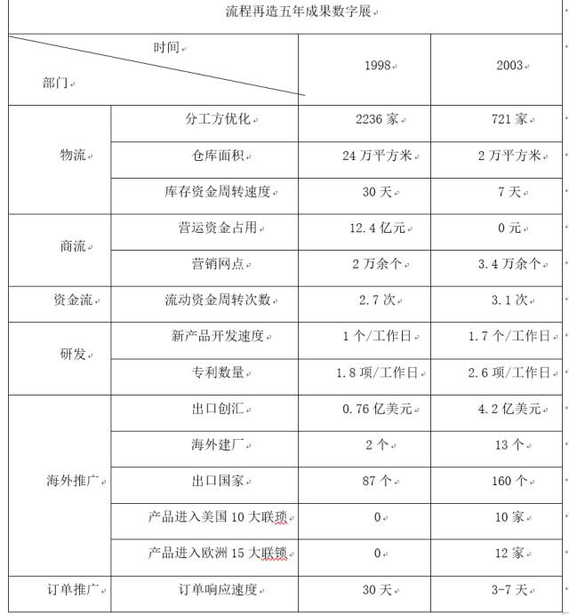海爾集團業(yè)務(wù)流程再造的效果如下表所示。從圖表中可以看到,經(jīng)過流程再造,海爾集團在物流、商流、資金流方面都取得了巨大進展,在研發(fā)、海外推廣、訂單推廣方面也取得了不菲的成績。