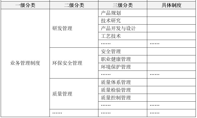 根據(jù)企業(yè)的業(yè)務(wù)主流程,將相似、相近、相關(guān)的經(jīng)營(yíng)管理活動(dòng)進(jìn)行歸并,可以確定業(yè)務(wù)管理制度的分類(lèi)。一般來(lái)說(shuō),業(yè)務(wù)管理制度包括業(yè)務(wù)拓展與營(yíng)銷(xiāo)管理、研發(fā)管理、生產(chǎn)管理(項(xiàng)目管理)、供應(yīng)鏈管理、質(zhì)量管理等若干二級(jí)制度模塊,與企業(yè)業(yè)務(wù)主流程是相吻合的。