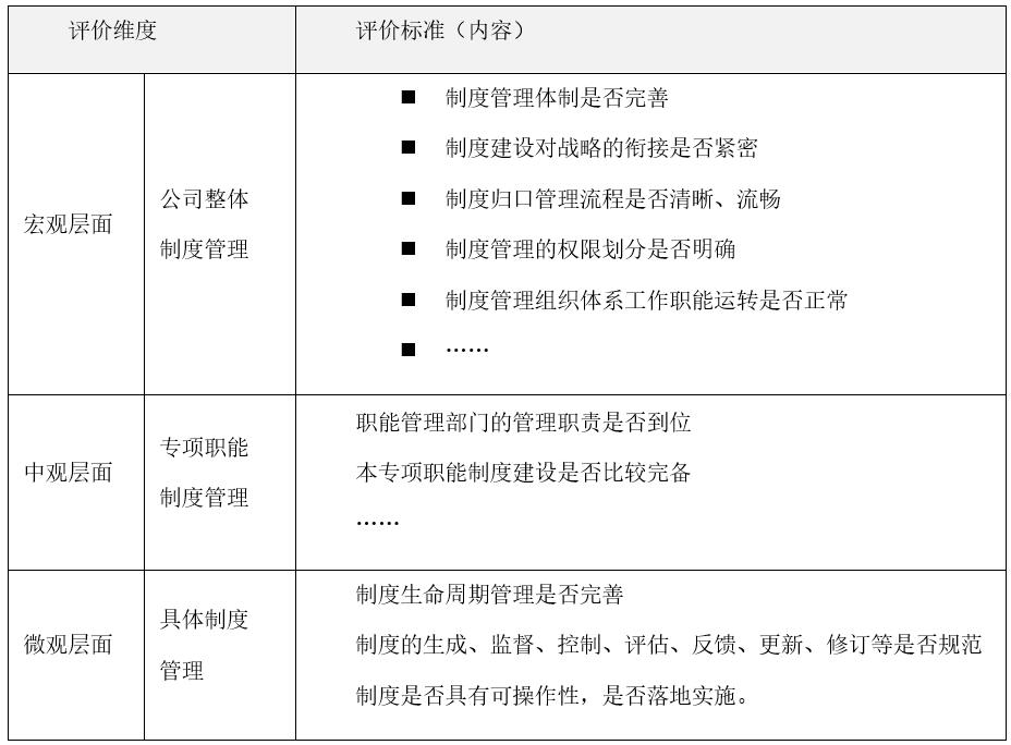 對于制度管理體系的評估,通常從宏觀管理(企業(yè)總體制度管理)、中觀管理(專項職能制度管理)和微觀管理(單體制度管理)三個層面進行分類評估,每個層面評估工作的側(cè)重點不同,其中: