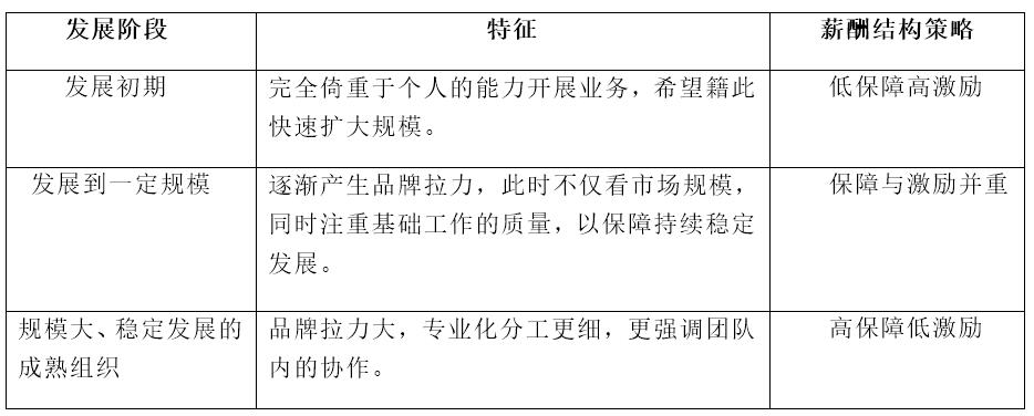 在實(shí)際應(yīng)用中,一般都是績(jī)效薪酬和基本薪酬各占一定的比例。當(dāng)兩者比例不斷調(diào)和變化時(shí),這種薪酬模型可以演變?yōu)橐约?lì)為主的模型,也可以演變?yōu)橐苑€(wěn)定為主的薪酬模型。伴隨著組織的發(fā)展,不同的發(fā)展階段薪酬結(jié)構(gòu)策略也是不盡相同的,如以下圖表所示:
