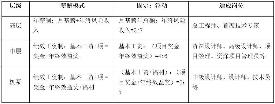 根據(jù)管理層級(jí)高低與承擔(dān)的責(zé)任輕重,薪酬收入中的固定部分(基本工資)和浮動(dòng)工資(項(xiàng)目獎(jiǎng)金、年終效益獎(jiǎng))的分配比例進(jìn)行不同設(shè)置: