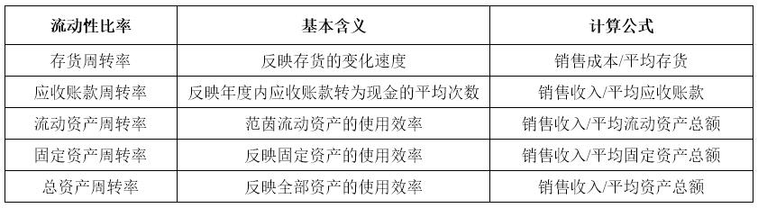 流動性指標(biāo)分析的目的是觀察企業(yè)在一定時期內(nèi)資金的周轉(zhuǎn)情況,是對企業(yè)資金活動的效率分析,主要指標(biāo)含義及計算公式如表3所示: